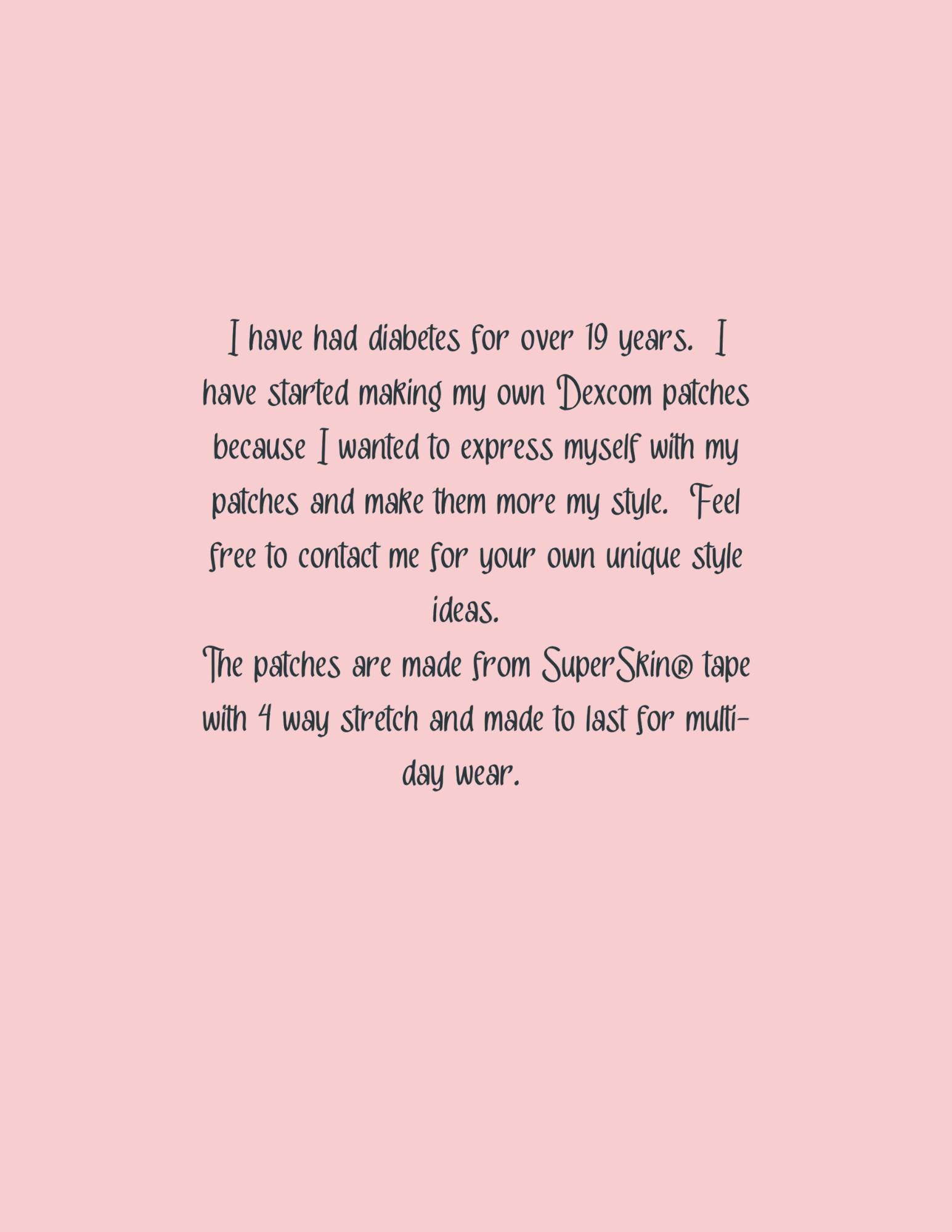 I have had diabetes for over 19 years. I have started making my own Dexcom patches because I wanted to express myself with my patches and make them more my style. Feel free to contact me for your own unique style ideas.