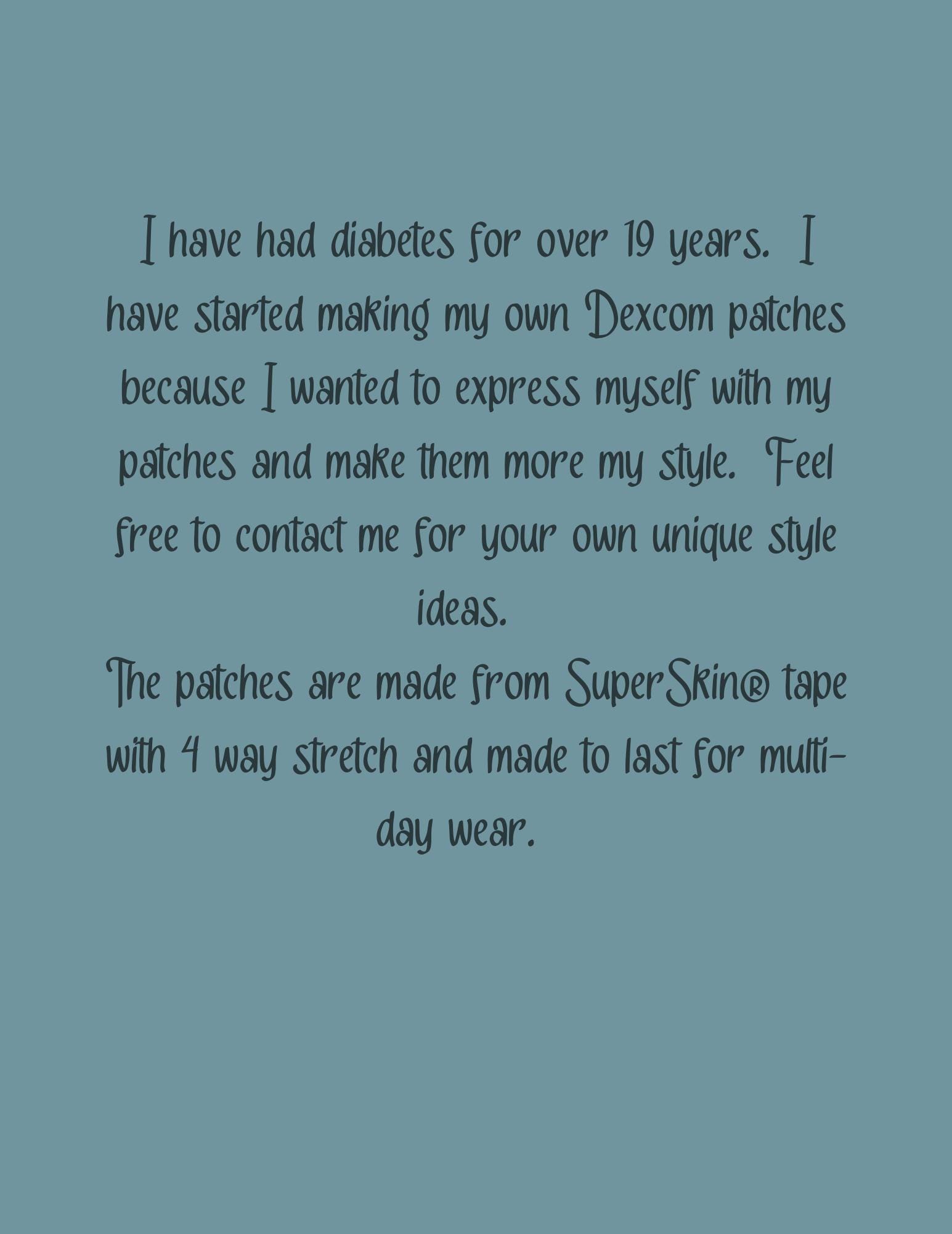 I have had diabetes for over 19 years. I have started making my own Dexcom patches because I wanted to express myself with my patches and make them more my style. Feel free to contact me for your own unique style ideas.