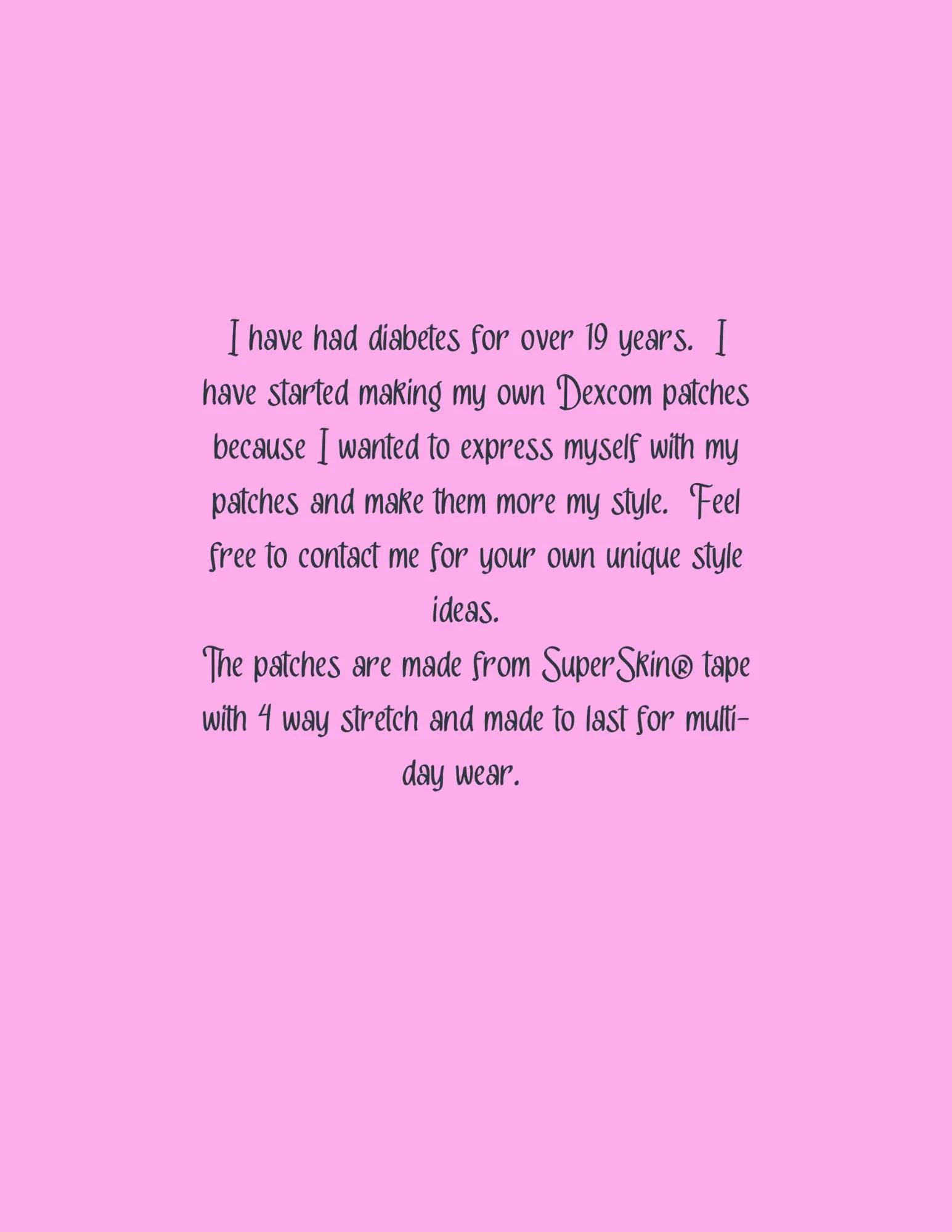 Avoid items with skin conditioners such as Dove Soap, body washes, laundry detergents, and perfumes, which can leave an oily residue. Wait approximately 30 minutes after showering and applying lotion to put the patch on. If you have oily skin, try an exfoliator. Make sure the area where you will be placing your patch is completely dry. You may want to consider using a product like Skin-Tac or an IV wipe across the entire area where you will be applying the patch. This can help with the adhesion of the patch. These items can be found on Amazon. Remove the center backing Apply the tape over your device while holding on to the top and bottom tape. Once the adhesive patch is placed correctly, remove the remaining paper and smooth the patch against your skin. If you experience other issues, please contact us. I have had diabetes for over 19 years. I have started making my own Dexcom patches because I wanted to express myself with my patches and make them more my style. Feel free to contact me for your own unique style ideas. The patches are made from SuperSkin® tape with 4 way stretch and made to last for multi-day wear.