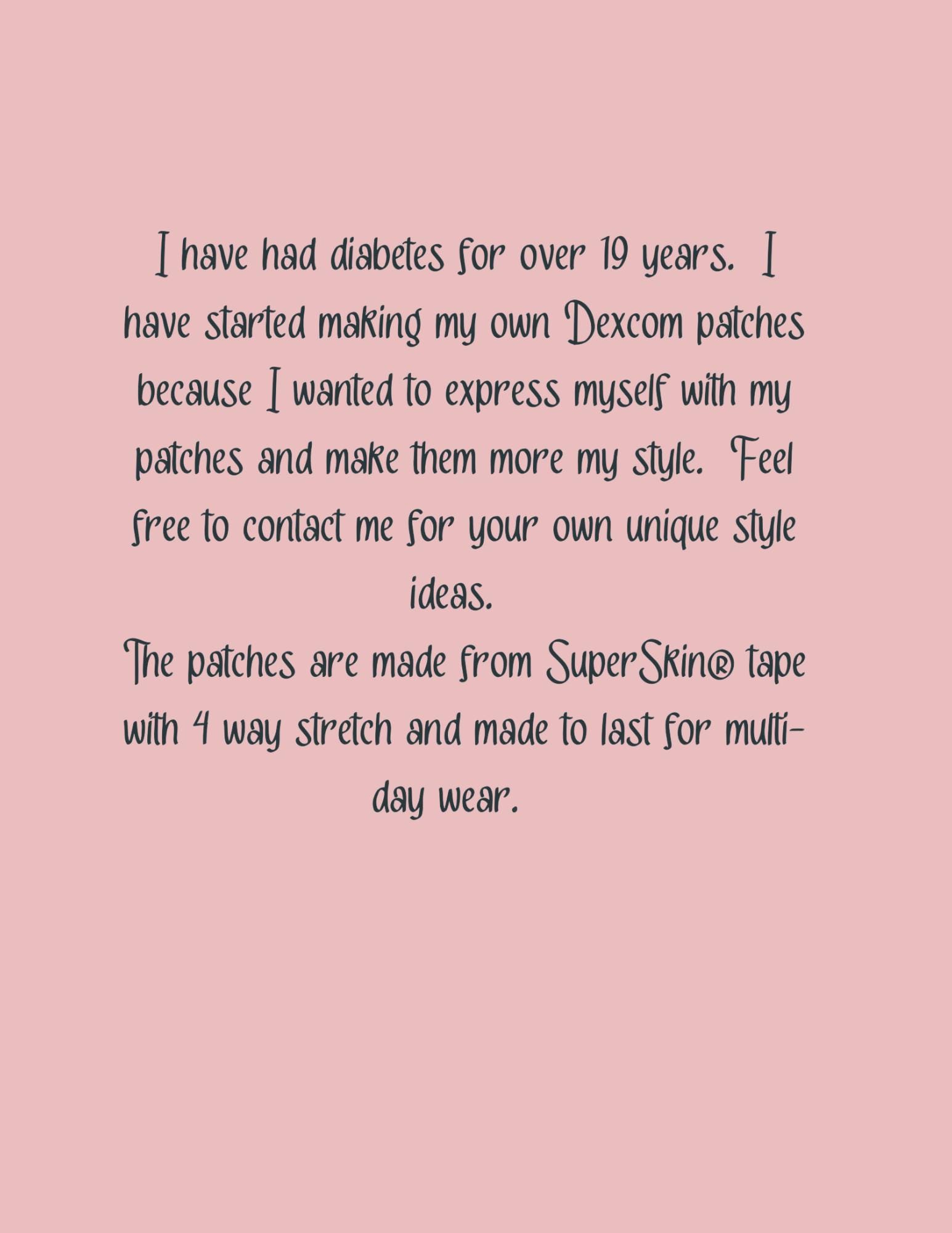 I have had diabetes for over 19 years. I have started making my own Dexcom patches because I wanted to express myself with my patches and make them more my style. Feel free to contact me for your own unique style ideas.