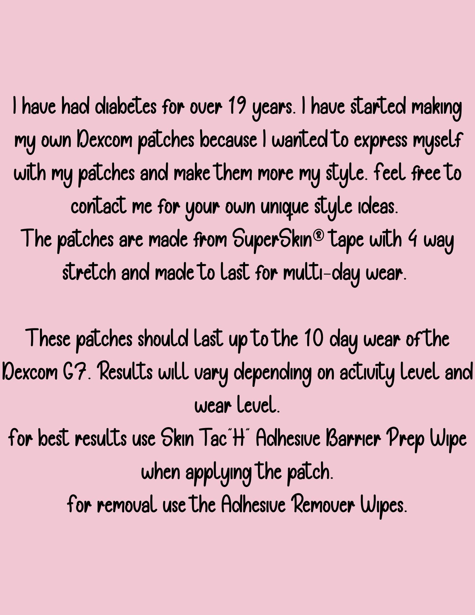 I have had diabetes for over 19 years. I have started making my own Dexcom patches because I wanted to express myself with my patches and make them more my style. Feel free to contact me for your own unique style ideas.