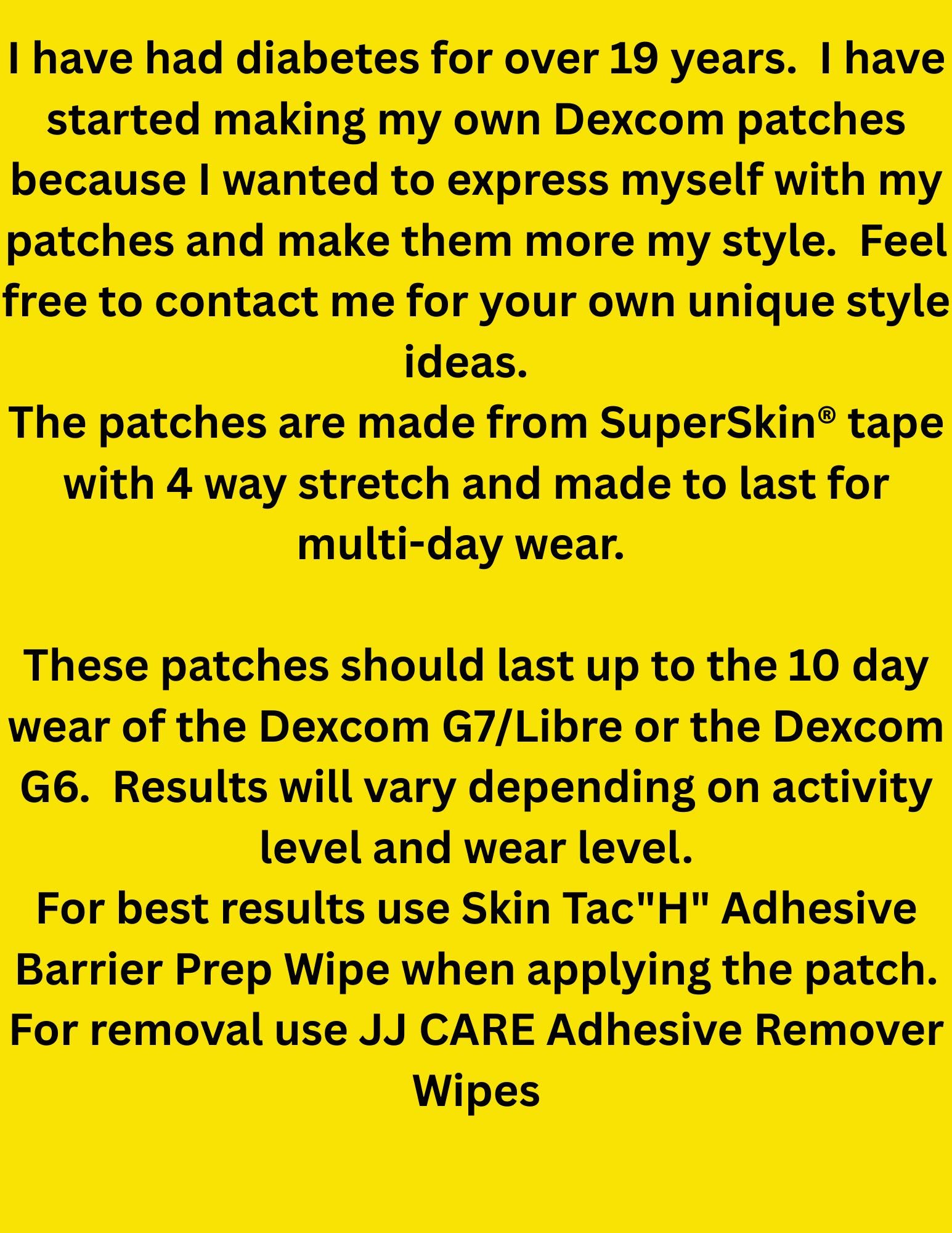 I have had diabetes for over 19 years. I have started making my own Dexcom patches because I wanted to express myself with my patches and make them more my style. Feel free to contact me for your own unique style ideas.